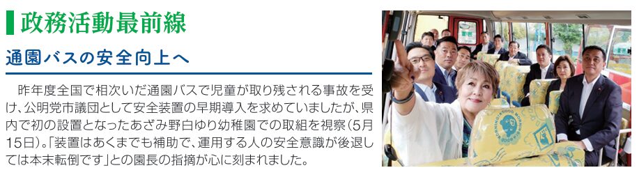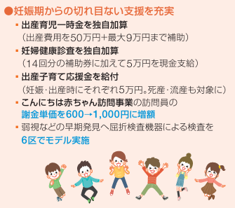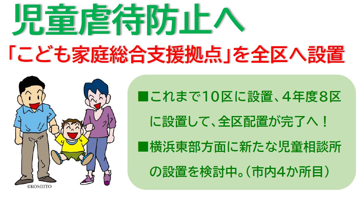 公明党が強力に推進する安心して子育てできる環境整備へ、区福祉保健センターと地域子育て支 援拠点が連携・協働し「子育て世代包括支援センター」として、妊娠期から子育て期までの支援を充実させます。保健師等の専門性を持つ母子保健コーディネーター(仮称)を市内3区にモデル配置し、母子健康手帳交付時に全妊婦と面接を行い、出産・子育て準備プランを策定し、個別の事情に沿って医療機関などと調整し、悩みに対する相談支援を切れ目なく行っていきます。また、産後うつの早期発見・支援に向けた取り組みも推進します。