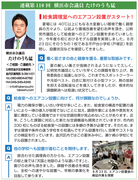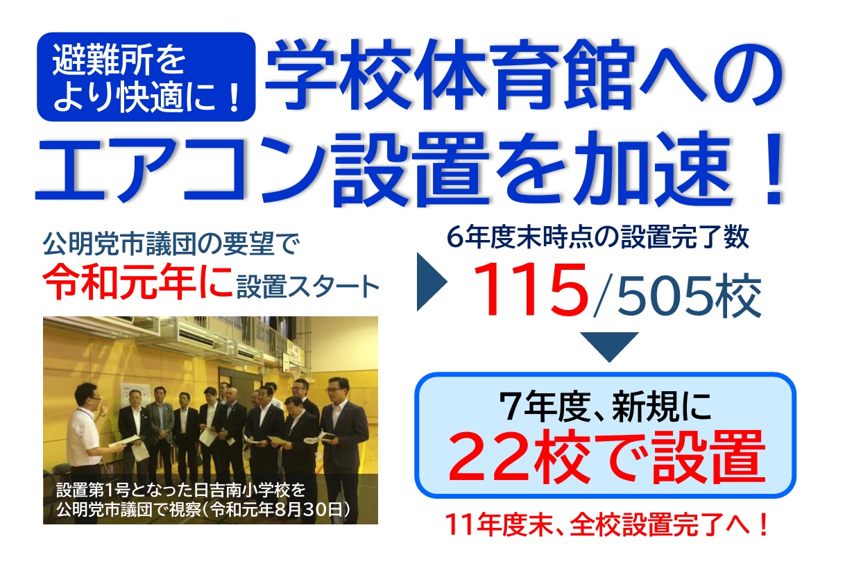 公明党からの強い申入れにより、令和元年度から学校体育館へのエアコン設置が開始されています。今年度は25校で工事が予定されているが、さらに着実に推進して頂きたい。