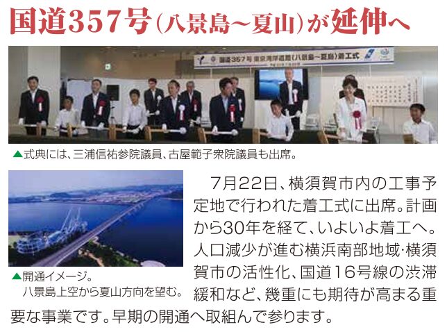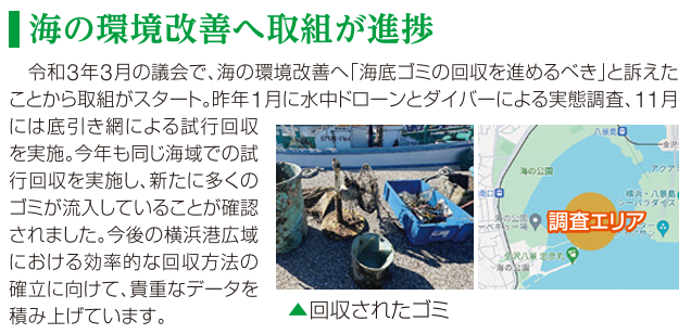 横浜市内で唯一市民が海に親しむことのできる野島や海の公園では、毎年の潮干狩りシーズンには多くの人出が見られます。しかし近年、外国人等による乱獲や貝殻の不法投棄などが指摘され、海の環境や安全性の悪化を懸念する声も多く寄せられています。加えて、国道357号の横須賀方面への延伸工事に伴う平潟湾内での工事も予定されており、良好な環境保全への対策が急務です。乱獲や不法投棄防止へ、漁業者による監視体制の仕組み構築などと合わせて、対策の強化を提案・要望しています。