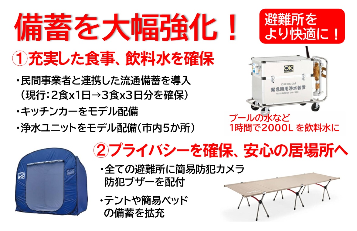また、震災時における大規模延焼火災の、消火対策の強化を要望。市長より、防火水槽の整備や組み立て式の大型水槽の導入。海や川から大量に送水するための車両の整備や消防艇の有効活用により消火対策を強化するとの答弁がありました。