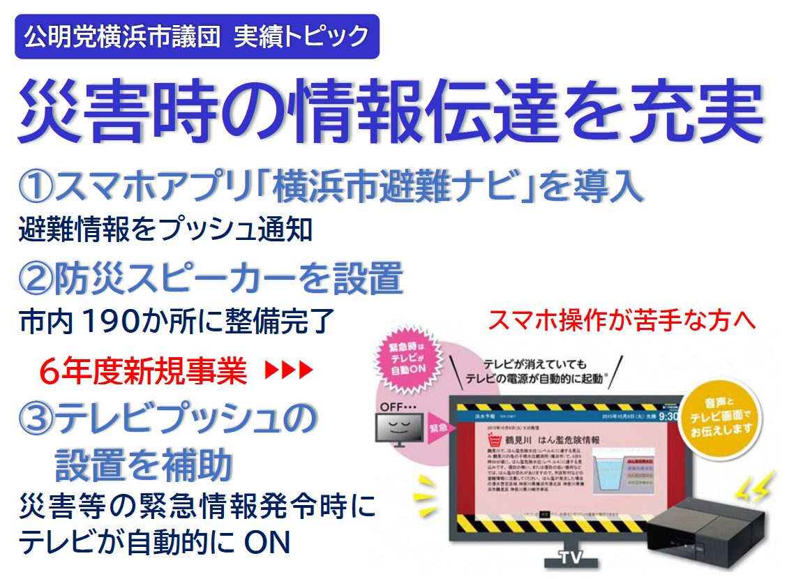横浜市が全国に先駆けて、平成25年度から行ってきた感震ブレーカーの設置補助事業の普及啓発と、さらなる促進策について質問。対象となる木造住宅密集地域の自治会・町内会からの申請にあたり、これまで構成員の8割の同意が必要としていた条件を、29年度から5割に緩和することが示されました。対象全34万世帯への無償配布を検討するなど、取組の加速を要望。
