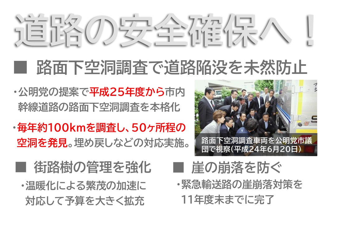 現在、区役所などで配布されている内水洪水ハザードマップの作成を提唱したのが市議会公明党です。近年の豪雨では、川の氾濫などにより多くの住宅が浸水被害を受けましたが、これらは実は「想定外」ではなく、それぞれ現地のハザードマップでも想定されていたもので、あらためて各種ハザードマップの重要性が認識されています。今後、実際の災害においてしっかりと活用されるように、更なる市民への周知・啓発にも力を入れて参ります。
