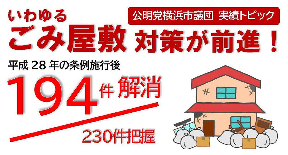 「横浜市建築物等における不良な生活環境の解消及び発生の防止を図るための支援及び措置に関する条例」(いわゆる「ごみ屋敷条例」)が、28年第3回定例会において、賛成多数で可決、制定されました。